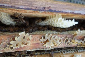 Mein größtes Volk wächst und gedeiht. Nachdem wir vor ein paar Wochen für ein anderes Volk eine Futterwabe entnommen haben, hat es die Gelegenheit gleich für Wildbau genutzt und die freie Fläche ausgebaut.