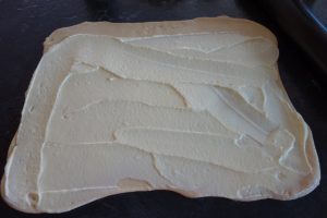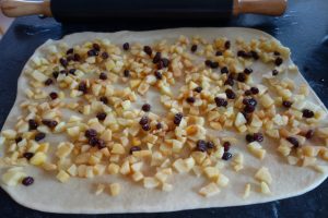 Gut aufgegangenen Teig nochmals durchkneten und halbieren. Jeweils zu einer Platte von ca. 30 x 30 cm ausrollen. Eine Hälfte mit der Quarkmasse bestreichen und einrollen. Die zweite Hälfte mit den Apfelwürfeln belegen. Nach Wunsch mit Nüssen, Rosinen (für mich am liebsten Rumrosinen) und Zimtzucker bestreuen. Wenn die Äpfel schon recht süß sind, auch nur Zimt verwenden. Ebenfalls einrollen.