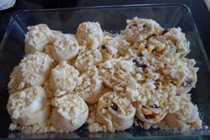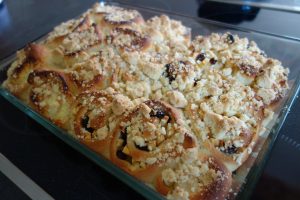 Ich verwende dann eine gefettete rechteckige Auflaufform (z.B. für Lasagne). Ich könnt auch ein hohes Backblech verwenden, dann einfach dünnere Scheiben schneiden. Für die Auflaufform jeweis 9 Scheiben (ca. 3 cm) schneiden und in die Form setzen. Die Schneckennudeln dann mit den Streuseln bestreuen.