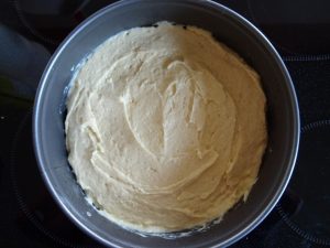 Die Butter mit dem Zucker und Vanillinzucker schaumig rühren. Nach und nach Eier und Schmand zugeben. Das Mehl mit dem Backpulver vermischen und unterrühren. Den Teig in der Backform verteilen und 15 min vorbacken.
