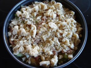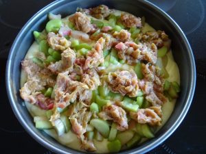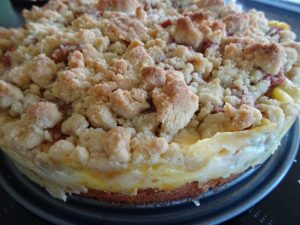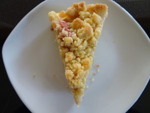 Nach dem Vorbacken den Pudding auf dem Teigverteilen. Den geschnittenen Rhabarber daraufgeben und das Mus löffelweise darüberklecksen. Die Streusel gleichmässig daraufstreuen. Weitere 30 – 35 Minuten backen.